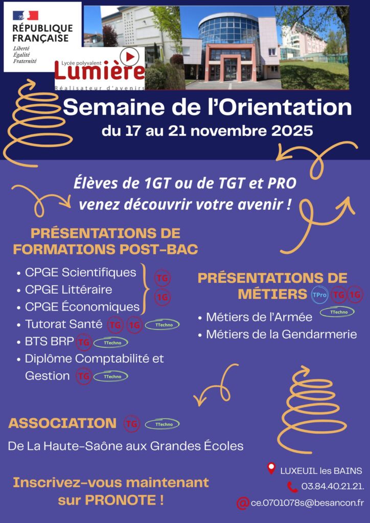 Dans le cadre du parcours Avenir, la semaine de l’orientation aura lieu du 17 au 21 novembre 2025. Ce temps fort a pour but d’aider les élèves à approfondir leurs connaissances des métiers et des formations et de construire leur projet d’orientation. Elle s’adresse principalement aux TGT et Pro ainsi qu’aux 1GT, avec des présentations de filières post-bac, de métiers et des échanges avec des étudiants. Pour assister à ces présentations, les élèves doivent s’inscrire sur Pronote.